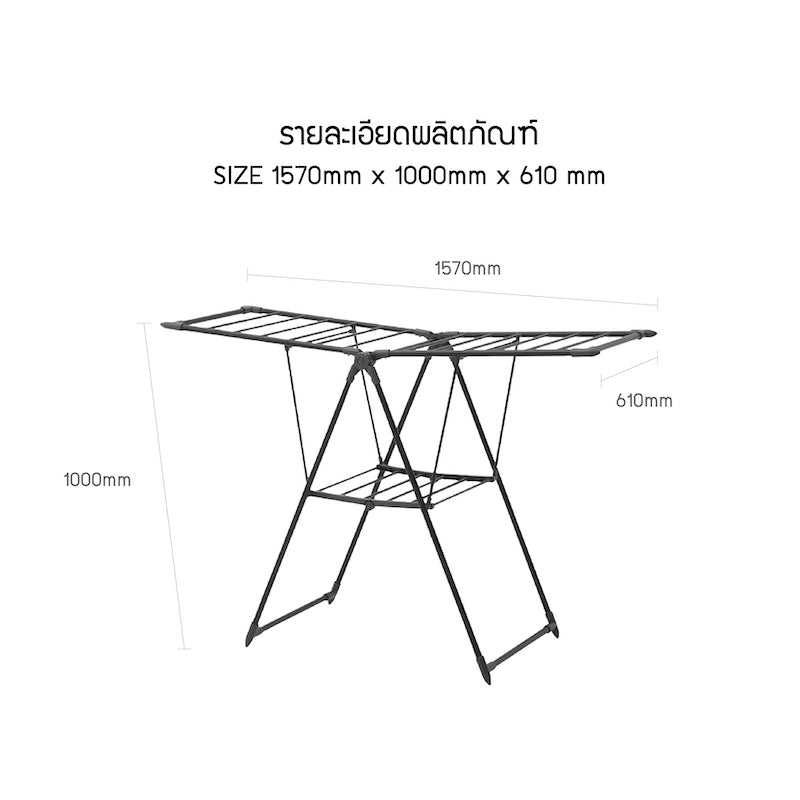 - ขนาด (กางราวตากผ้า) ก. 61 ซม. / ย. 157 ซม. / ส. 100 ซม.
