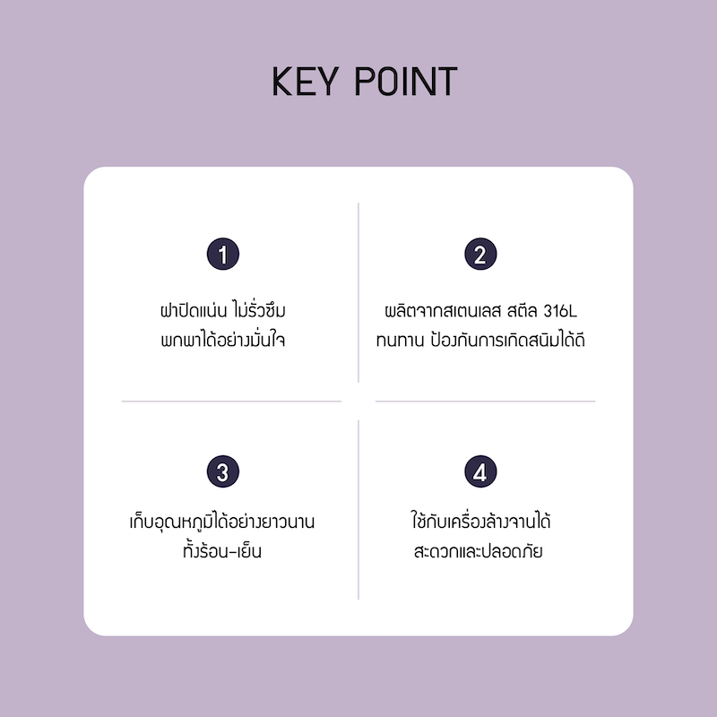 • โครงสร้างสุญญากาศสองชั้น ช่วยเก็บความร้อน - เย็นได้ยาวนาน (เก็บเย็นนานสุด 41 ชม. เก็บร้อนได้นาน 14 ชม.).