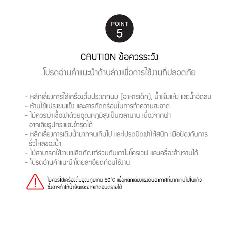 วัสดุ สแตนเลส สตีล 304 , ฝา ที่จับ : พลาสติก PP , หลอด : พลาสติก PE , วงแหวนซีล: ซิลิโคนเกรดอาหาร