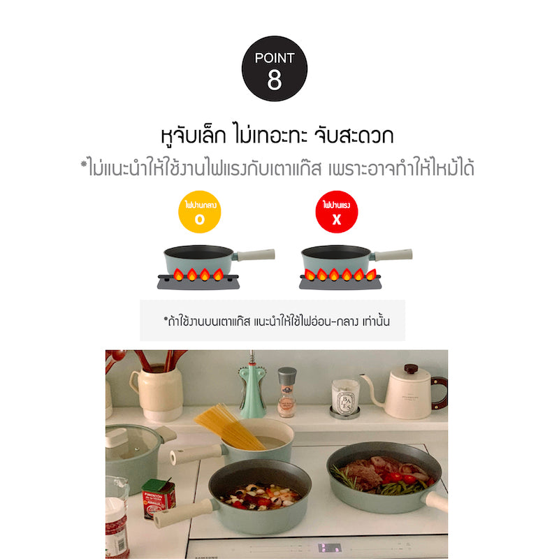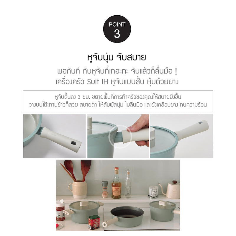 - พร้อมหูจับที่นุ่มสบาย ความยาวที่สั้นลง 3 ซม. ทำให้เครื่องครัวมีพื้นที่มากขึ้น