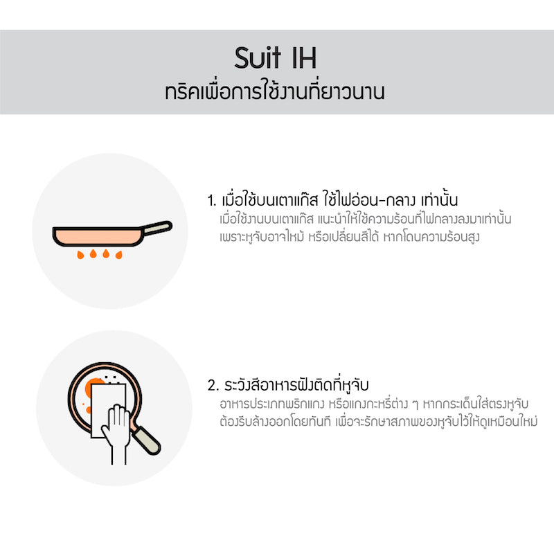 - ระวังสีอาหารติดหูจับ (พริกแกง แกงกระหรี่) หากสีติด ให้รีบล้างออกทันที